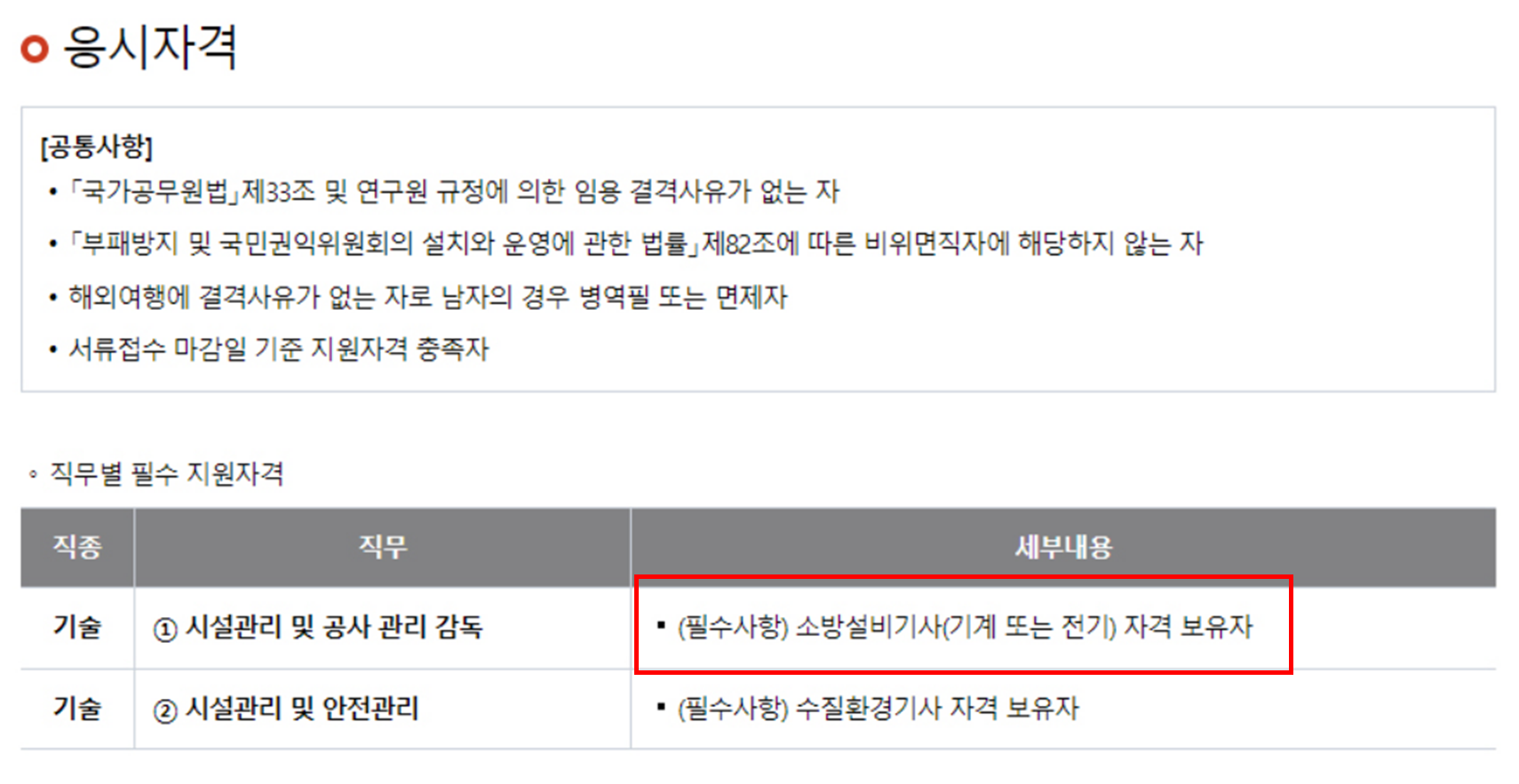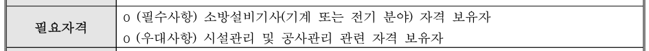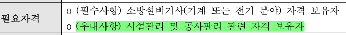 (3) 필수자격인 소방설비기사(기계 또는 전기 분야) 외 시설관리 및 공사관리 관련 자격 보유자는 우대될 수 있음.