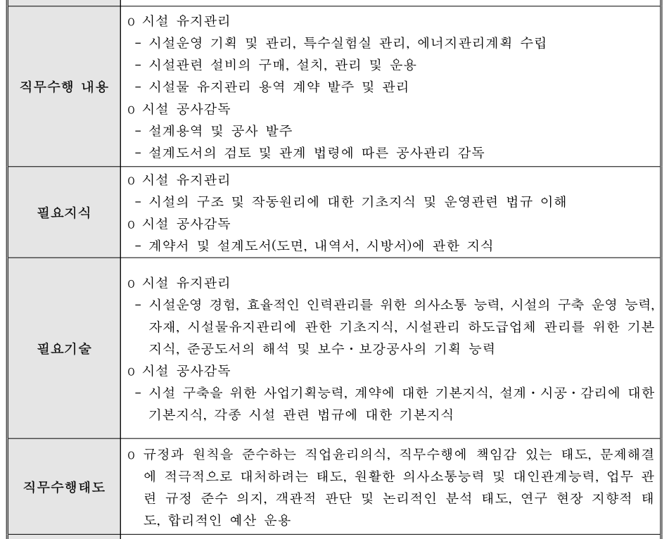 시설관리 및 공사관리 관련 자격 : 전기기사, 전기공사기사, 공조냉동기계기사, 건축설비기사, 건축기사, 위험물산업기사, 가스기사 등