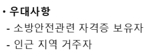 | 우대사항 | - 소방안전관련 전공자 - 소방안전관련 자격증 보유자 |