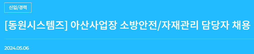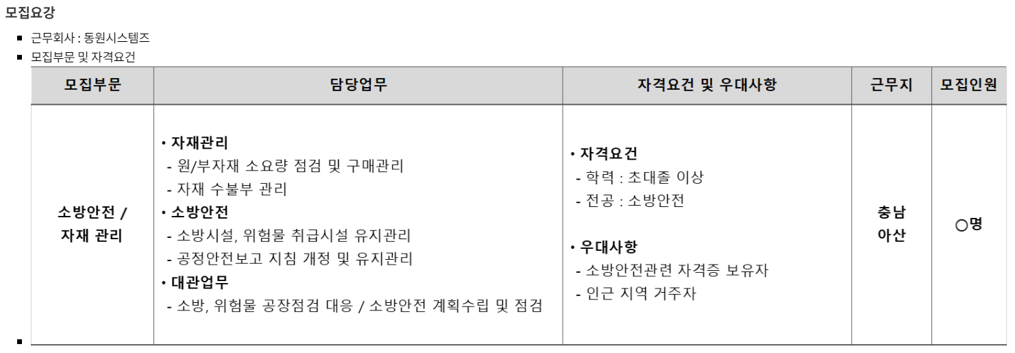 최근 신사업으로 2차전지용 캔을 제조하는 동원시스템즈 아산사업장 생산지원팀에 소속되어 소방안전/자재관리 업무를 담당할 신입직 채용공고에 대해 포스팅해보았습니다. 직무소개, 자격요건, 우대사항, 전형일정, 근무지, 인재상, 복지제도(복리후생), 채용공고 분석 및 평가를 해보았으니 많은 참고 바랍니다.