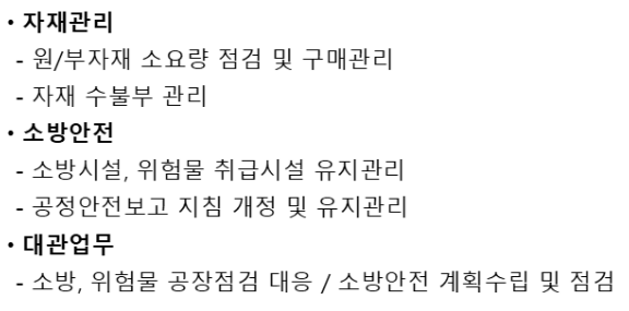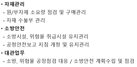 : 자재관리(생산지원) 업무 + 소방안전관리업무(소방+위험물) + PSM업무(공정안전보고 지침 개정 및 유지관리 + 대관업무