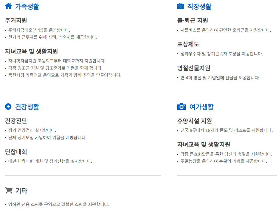 복리후생 직원과 가족의 행복하고 더 나은 삶을 위한 다양한 복리후생을 제공합니다. 가족생활 주거지원 주택자금대출(신협)을 운영합니다. 원거리 근무자를 위해 사택, 기숙사를 제공합니다.