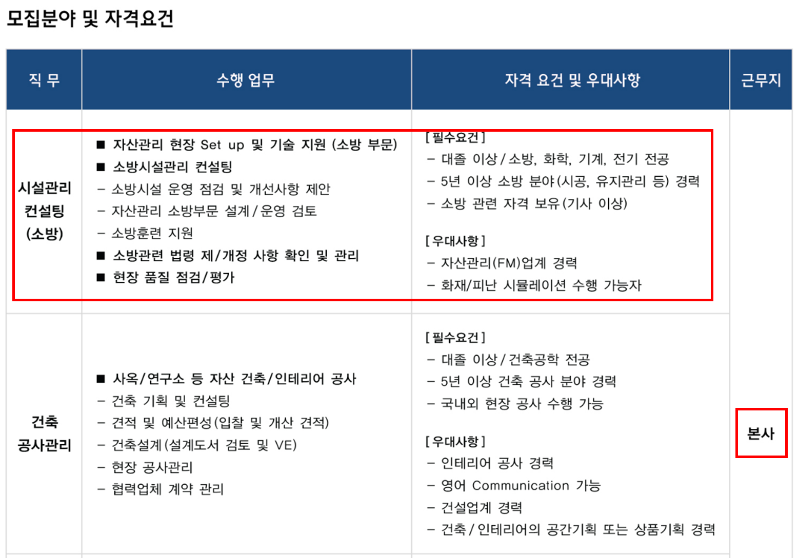 (2) 주로 현대계열 본사 건물 또는 현대엔지니어링에서 자산관리를 해주는 고객사 건물들에 대한 소방분야 컨설팅, 지원을 해주는 포지션을 뽑는 공고임.