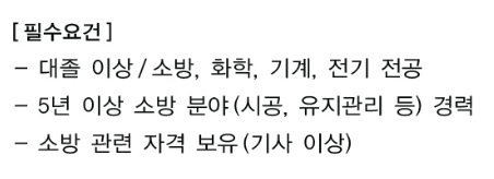 (4) 이번 채용공고를 포스팅한 이유는 에스앤아이코퍼레이션(구 LG서브원), 삼성에스원 과 같은 FM 업무를 하는 회사에서의 FM소방 업무, 건설사에서 소방설비 시공 경험 또는 소방시설 공사업 또는 자체점검(관리업) 종사자들이 5년 정도의 커리어가 쌓이면 이런 곳으로도 이직이 가능하다는 것을 알았으면 함.