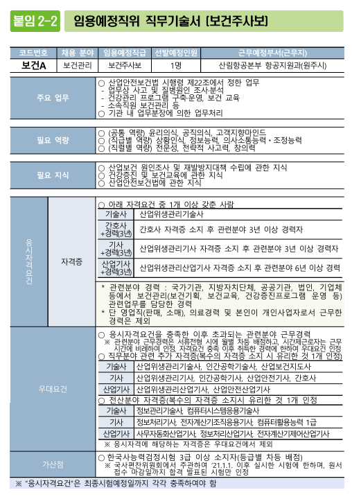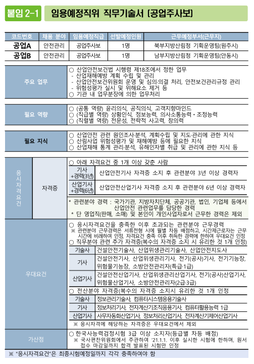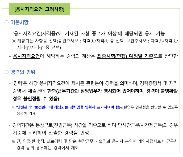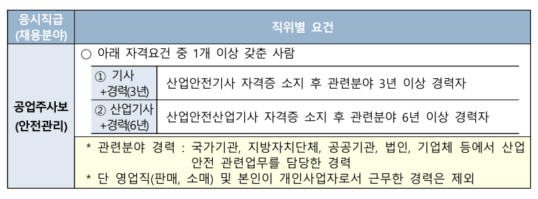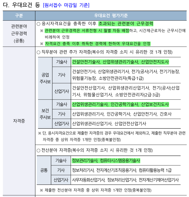 (4) 우대요건을 보면 기술사, 지도사가 있으면 우대되고 있음. 누누히 얘기하지만 기술사, 지도사 정도의 자격을 소지하고 있으면 공무원, 공공기관, 대기업 채용 시에도 우대되고 무적 스펙이 되므로 산업안전지도사, 건설안전기술사, 산업위생관리기술사, 인간공학기술사, 산업보건지도사 자격에도 관심을 가지고 도전해볼 것.