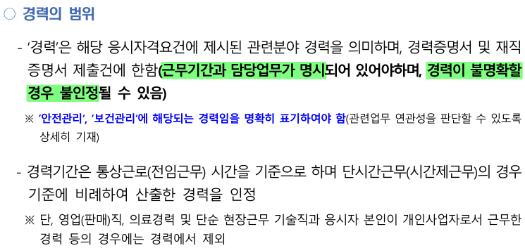 (5) 블로그를 통해 경력 산정에 대한 문의를 많이 주고 계심. 주의할 점은 지금 자신이 속한 회사에서 경력증명서, 재직증명서를 출력해줄 때 꼭꼭 안전관리, 보건관리에 해당되는 경력임이 명확히 표기되어야 하는데 간혹 안전관리/보건관리 업무를 겸직 또는 보조로 업무를 수행 하고 있는 경우 회사에서 잘 표기 안해주는 경우가 많음. 회사의 담당부서(보통 인사팀, 인재팀)와 잘 쇼부하여 경력증명, 재직증명을 잘 받아야 함.