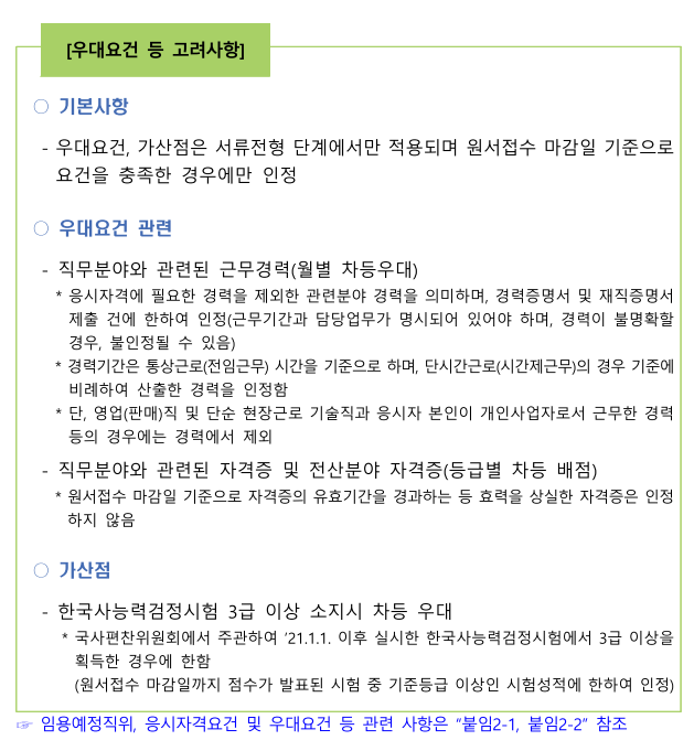 우대요건을 보면 관련경력(공무원경력 + 민간경력 통산)이 많을수록 좀 더 우대되며, 직무분야와 관련된 자격증의 등급이 높을수록 우대됨. 한국사능력검정시험 3급 이상 소지 시 차등 우대됨.