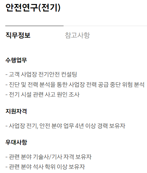 (3) 이번 안전연구(전기) 직무는 전기 관련 분야를 전공하였으며 타 기업에서 전기안전관리자 업무를 수행해보았거나 전기안전컨설팅 등 수행자, 전기공학 관련 석사, 박사 소지자들이 지원할만한 포지션임.
