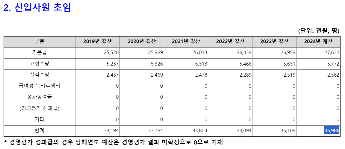 신입사원 초임(연봉) : 약 3,677만원(경영평가 성과급 제외)