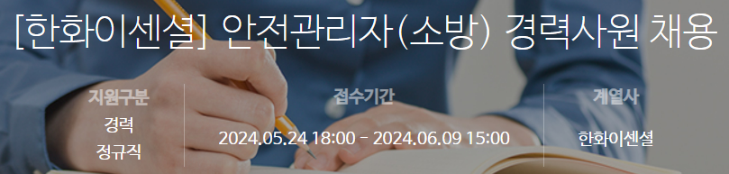 2024년 06월 09일 15시 00분 까지 모집하는 [한화이센셜] 안전관리자(소방) 경력사원 채용 채용공고 입니다.