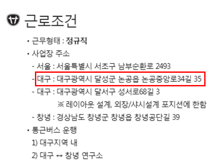 (3) 대구는 굉장히 살기 좋은 도시이자 광역시이지만, 대구에는 이렇다할 큰 기업이 많이 없긴해서 대동, 대구텍, 에스엘, 엘앤에프 정도 들어가면 괜찮다고 생각됨. 통근버스가 있어서 달성군이라도 출퇴근이 좋음.