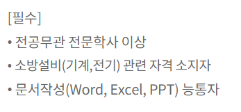 (2) 소방방재학과, 소방공학과 등 소방관련 전문학사(또는 학사)를 졸업하신 분들이 계속 배출되고 있으나 소방안전관리 분야에 대해 신입사원을 뽑는 채용공고가 많지않아 작은 소방점검업체, 소방설계업체부터 시작하시는 분들이 많음. 이번 채용공고는 소방 전공자 분들(또는 소방설비산업기사(또는 기사) 소지자분들)이 사회에 첫발을 내딛는 시기에 괜찮은 커리어로 출발할 수 있는 회사라 생각됨.