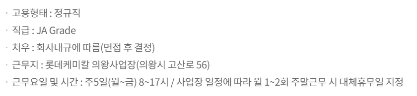 롯데물산에서 롯데케미칼 의왕사업장의 자산관리(안전환경)를 담당할 전문학사 이상의 신입사원을 모집해. ...