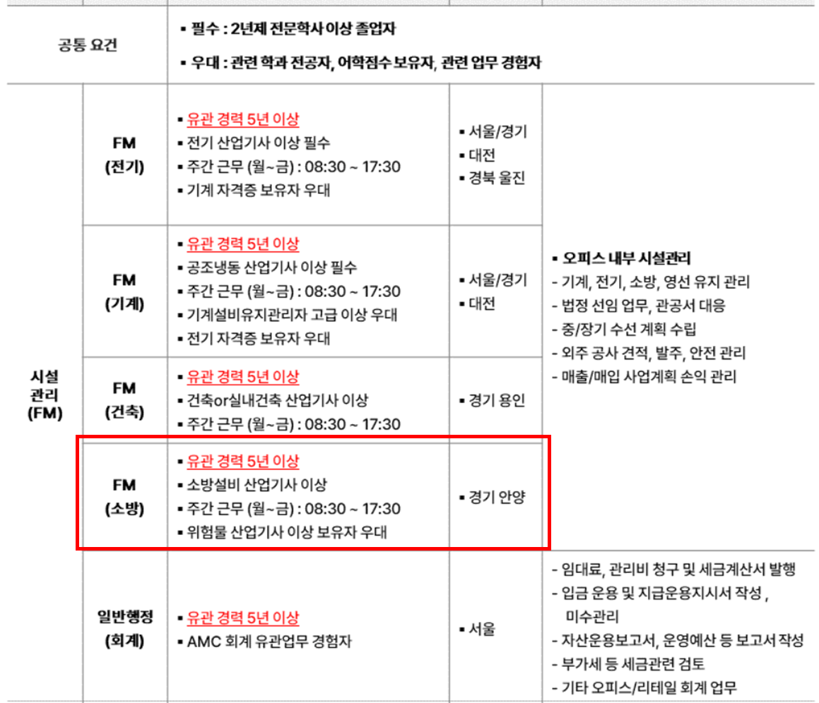 (2) FM 업무에서 가장 원하는 요건 중 하나는 해당분야 경력과 자격증임. 신입으로도 물론 뽑기도 하지만 경력으로 더 채용을 많이하고 있음. 아래와 같은 자격증(소방분야의 경우 소방설비산업기사 이상 자격 보유자)을 요구하는 이유는 보통 관리하는 건물, 사업장들이 최소 1급 이상이며 특급에 해당하는 건물들이 많기 때문에 소방안전관리자, 보조자로 선임을 해야하기 때문임.
