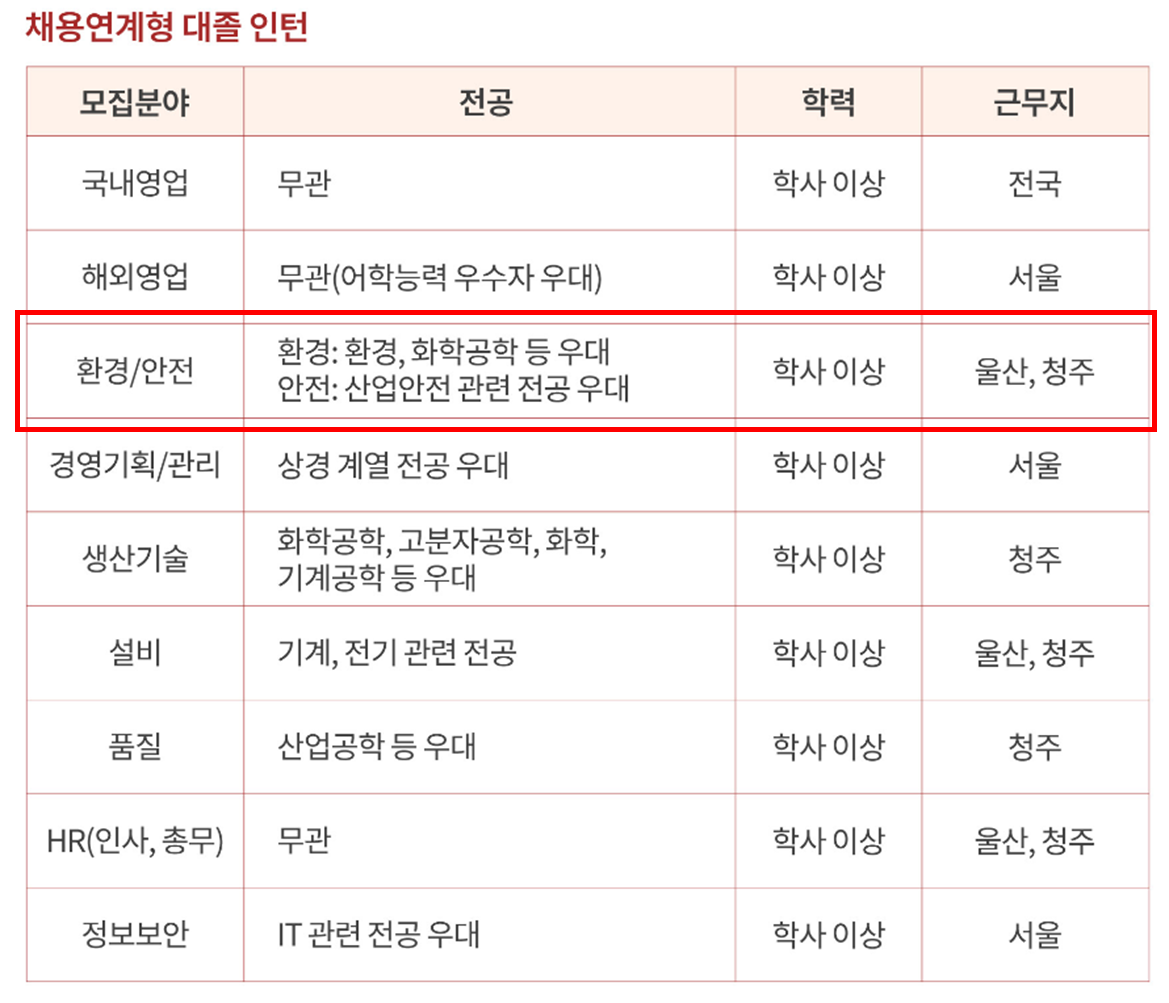 역으로 인턴 경험을 통해 이 회사에 대해 파악할 수 있는 기회가 될 수 있으며 청주공장, 울산공장에서 미리 생활해보고 마음에 들지 않으면 입사를 스스로 결정하지 않아도 된다는 장점도 있음. 인턴 과정은 지원자와 회사가 서로를 알아가기 위한 시간 이라는 표현이 마음에 듬.