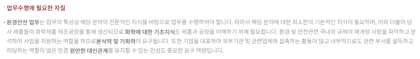(2) 별도의 기사 자격은 요구하지 않으나 아래 전공 외 산업안전기사, 산업위생관리기사, 대기환경기사, 수질환경기사, 화공기사, 위험물산업기사 등의 자격을 보유하고 있으면 채용 시 유리할 것으로 보임.