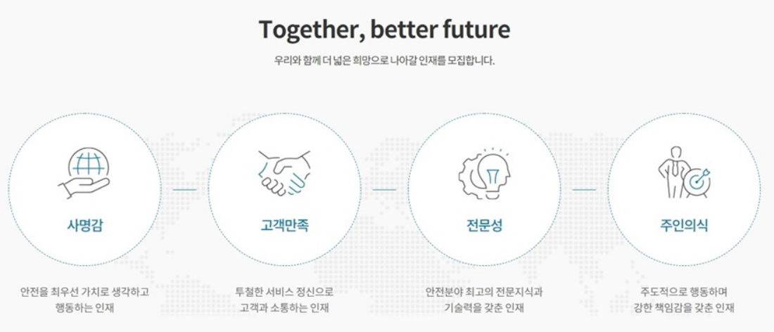 : 안전에 대한 사명감과 고객만족을 바탕으로 안전문화를 선도하며, 전문성과 주인의식으로 조직발전에 기여하는 인재
