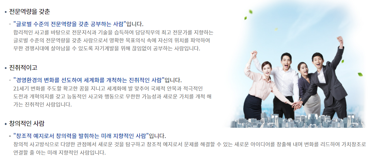 인재상 전문역량을 갖춘 "글로벌 수준의 전문역량을 갖춘 공부하는 사람"입니다. 합리적인 사고를 바탕으로 전문지식과 기술을 습득하여 담당직무의 최고 전문가를 지향하는 글로벌 수준의 전