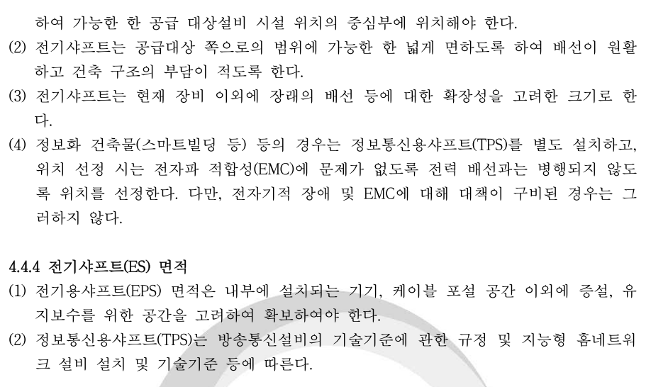 EPS실(전기용샤프트실, 전기피트실), TPS실(정보통신용샤프트실, 통신피트실) 설치 관련 법(법령, 법규, 기준, 규칙, 규정, 근거)를 찾아보았습니다.