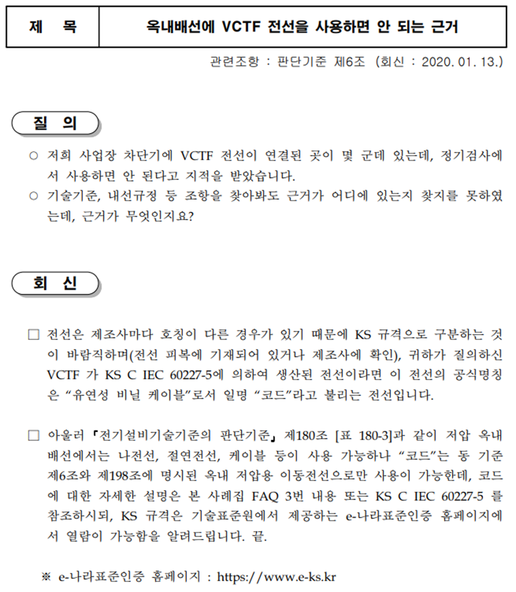 VCTF전선의 옥내배선(고정배선) 사용 금지 관련 법(법령, 법규, 기준, 규칙, 규정, 근거, CODE, 코드)