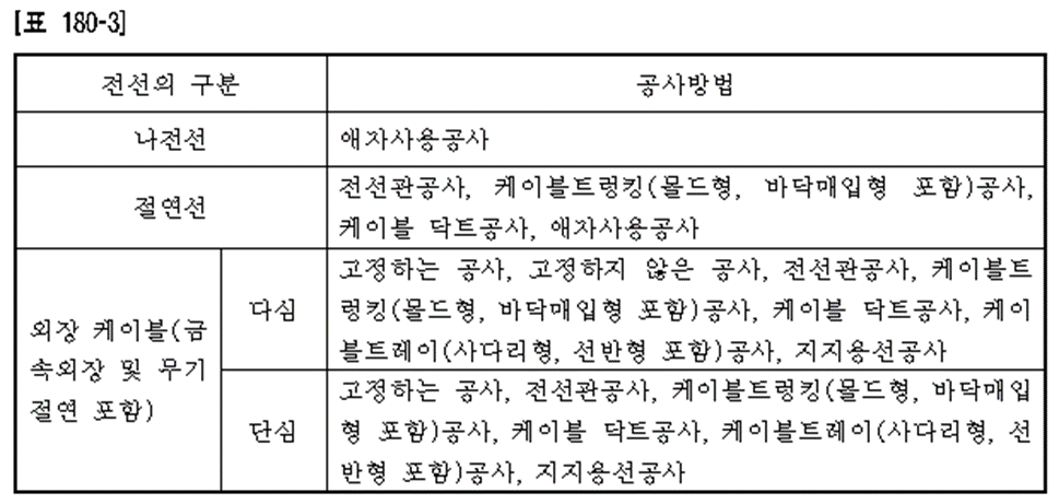 | 전기설비기술기준의 판단기준 제6조(코드) ① 코드는 「전기용품 및 생활용품 안전관리법」에 의한 안전인증을 받은 것을 사용하여야 한다. ② 코드는 이 판단기준에서 허용된 경우에 한하여 사용할 수 있다. 제180조(저압 옥내배선의 시설장소별 공사의 종류) ① 저압 옥내배선(제199조부터 제202조까지에 규정하는 장소와 제205조에 정하는 경우를 제외한다)은 합성수지관 공사․금속관 공사․가요전선관(可橈電線管) 공사나 케이블 공사 또는 표 180-1에서 정하는 시설 장소 및 사용전압의 구분에 따른 공사에 의하여 시설하여야 한다. ② 제1항 이외의 저압 옥내배선은 표 180-2와 표 180-3과 같이 선정 및 시공하며, KS C IEC 60364-5-52에 따라 시설하여야 한다. ![]() 제198조(옥내 저압용 이동전선의 시설) ⓛ 옥내에 시설하는 저압의 이동전선(전기사용장소에 시설하는 전선 중 조영물에 고정시키지 아니하는 것을 말하며 전구선 및 전기사용기계기구 안의 전선을 제외한다. 이하 같다)은 제244조제1항제7호(제245조에서 준용하는 경우를 포함한다)에 규정하는 이동전선을 제외하고는 다음 각 호의 것이어야 한다. 1. 옥내에 시설하는 사용전압이 400V 이하인 이동전선은 고무코드 또는 0.6/1 ㎸ EP 고무 절연 클로로프렌 캡타이어케이블로서 단면적이 0.75mm2 이상인 것일 것. 다만, 전기면도기․전기이발기 기타 이와 유사한 가정용 전기기계기구에 부속하는 이동전선에 길이 2.5m 이하인 금사(金絲) 코드를 사용하고 또한 이를 건조한 장소에서 사용하는 경우, 「전기용품 및 생활용품 안전관리법」의 적용을 받는 장식용 전등 기구(직렬식의 것에 한한다)에 부속된 이동용 전선을 건조한 장소에서 사용하는 경우, 제207조의 규정에 의하여 리프트 케이블을 사용하는 경우 또는 제247조의 규정에 의하여 용접용 케이블을 사용하는 경우에는 그러하지 아니하다. 2. 옥내에 시설하는 사용전압이 400V 초과인 저압의 이동 전선은 0.6/1kV EP 고무 절연 클로로프렌 캡타이어케이블로서 단면적이 0.75mm2 이상인 것일 것. 다만, 전기를 열로 이용하지 아니하는 전기기계기구에 부속된 이동 전선은 단면적이 0.75mm2 이상인 0.6/1kV 비닐절연 비닐캡타이어 케이블을 사용하는 경우에는 그러하지 아니하다. ② 방전등․라디오 수신기․선풍기․전기 이발기․전기스탠드 기타 전기를 열로 이용하지 아니하는 전기사용기계기구․전기 이불․전기온수기 기타 고온부가 노출하지 아니하고 또한 이에 전선이 접촉할 우려가 없는 구조의 전열기(전열기와 이동 전선의 접속부의 온도가 80℃ 이하이고 또한 전열기의 외면의 온도가 100℃를 초과할 우려가 없는 것에 한한다) 또는 이동 점멸기에 부속된 이동 전선에는 제1항의 규정에 불구하고 단면적이 0.75mm2 이상인 유연성 비닐 절연전선(코드) 또는 0.6/1kV 비닐절연 비닐캡타이어 케이블을 사용할 수 있다. ③ 옥내에 시설하는 저압의 이동전선에 접속하는 전기사용기계기구의 금속제 외함에 제33조제1항의 규정에 의하여 접지공사를 하는 경우에 그 이동전선으로 사용하는 다심코드 또는 다심 캡타이어 케이블의 선심의 하나를 접지선으로 사용하는 때에는 그 선심과 전기사용기계기구의 외함 및 조영물에 고정되어 있는 접지선과의 접속에는, 다심 코드 또는 다심 캡타이어 케이블과 전기사용기계기구 또는 옥내배선과의 접속에 사용하는 꽂음 접속기 기타 이와 유사한 기구의 1극을 사용하여야 한다. 다만, 다심 코드 또는 다심 캡타이어 케이블과 전기사용기계기구를 나사로 고정하여 접속하는 경우에는 다심 코드 또는 다심 캡타이어 케이블과 전기사용 기구와의 접속에 대하여는 그러하지 아니하다. ④ 제3항의 꽂음 접속기 기타 이와 유사한 기구의 접지선에 접속하는 1극은 다른 극과 명확하게 구별할 수 있는 구조로 되어 있는 것이어야 한다. ⑤ 옥내에 시설하는 저압의 이동전선과 저압 옥내배선과의 접속에는 꽂음 접속기 기타 이와 유사한 기구를 사용하여야 한다. 다만, 이동전선을 조가용선에 조가하여 시설하는 경우에는 그러하지 아니하다. ⑥ 옥내에 시설하는 저압의 이동전선과 전기사용기계기구의 접속에는 꽂음 접속기 기타 이와 유사한 기구를 사용하여야 한다. 다만, 사람이 쉽게 접촉할 우려가 없도록 시설한 단자 금속물에 코드를 나사로 고정시키는 경우에는 그러하지 아니하다. |