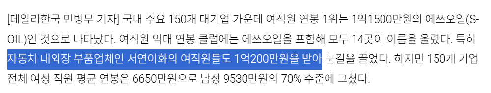 여직원 연봉퀸 에쓰오일 1억1500만원...서연이화도 깜짝 1억 - 데일리한국