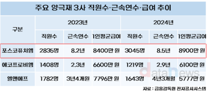 포스코퓨처엠, 양극재 3사 중 홀로 직원수·평균 연봉 올랐다