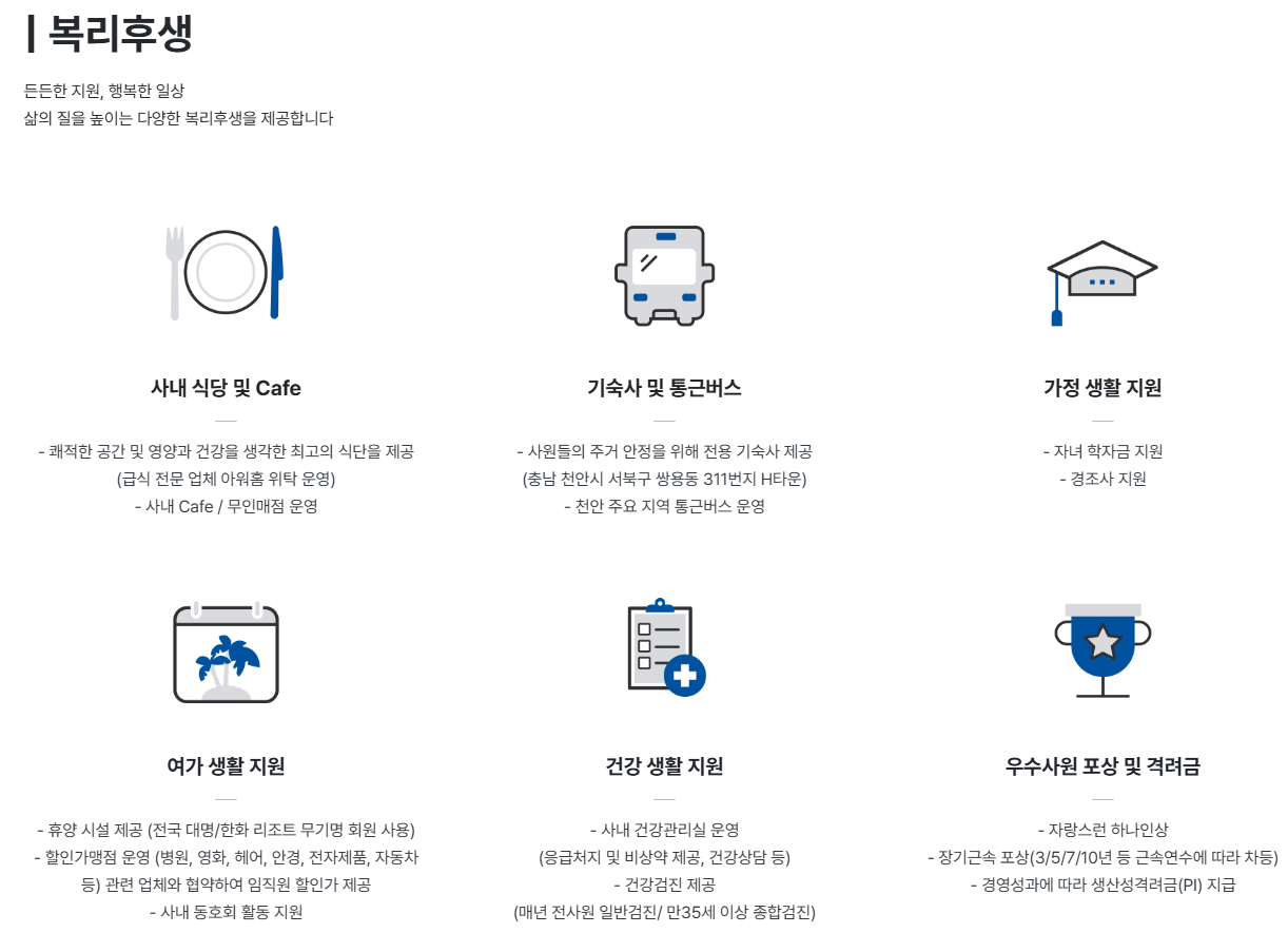 - 복지 👉 기숙사, 식사, 통근버스 등 생활형 복지 강점