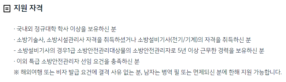 - 소방설비기사 + 1급 소방안전관리자 5년 이상 경력
