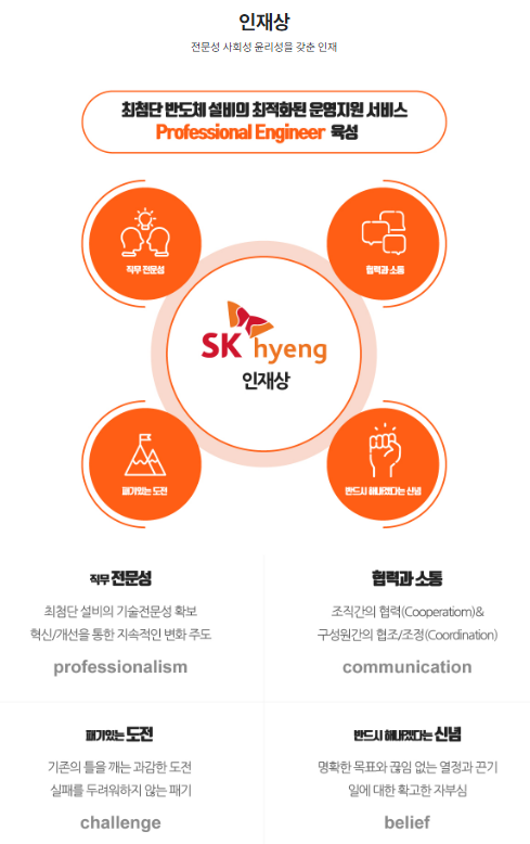: 직무 전문성, 협력과 소통, 패기있는 도전, 반드시 해내겠다는 신념