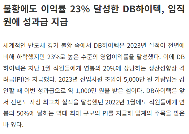 ㅇDB하이텍 성과급 관련 기사