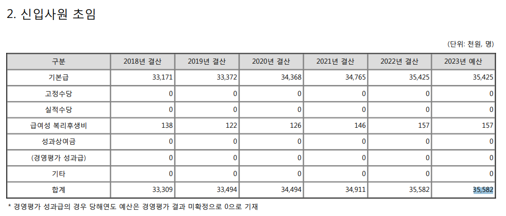 : 경영평가 성과급을 제외한 기본급, 급여성 복리후생비를 합친 금액은 3,558만원 정도임.