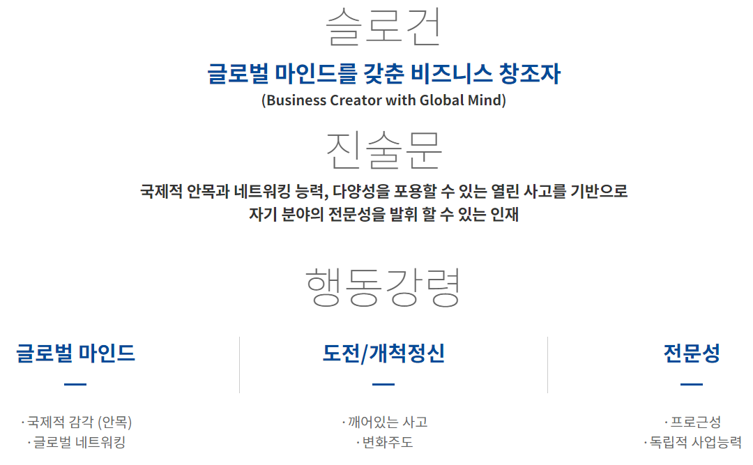 : 글로벌 마인드, 도전/개척정신, 전문성