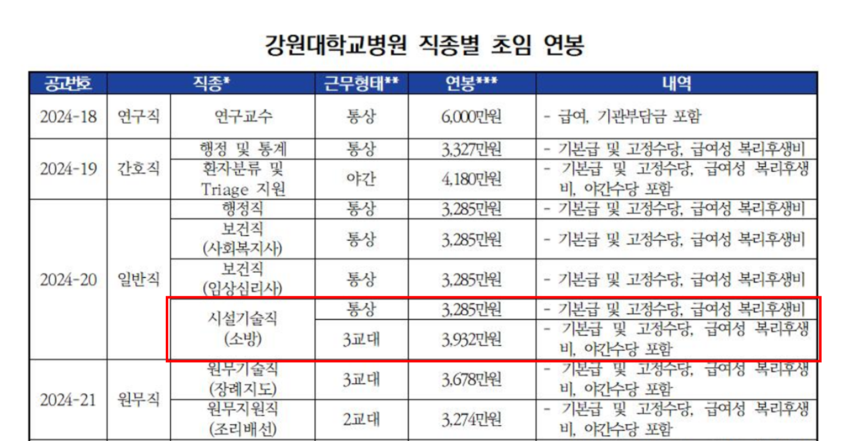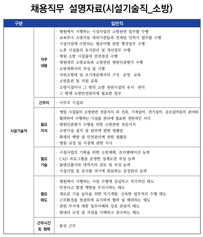 강원대학교병원 시설기술직(소방)분야 채용공고에 대해 포스팅해보았습니다. 직무소개, 자격요건, 우대사항, 전형일정, 근무지, 인재상, 복지제도(복리후생), 채용공고 분석 및 평가를 해보았으니 많은 참고 바랍니다.