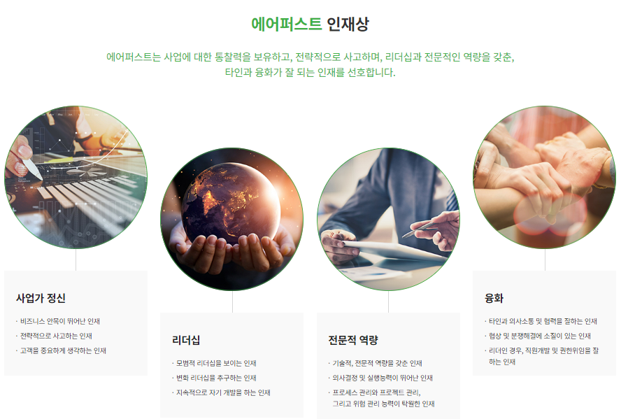 : 에어퍼스트는 사업에 대한 통찰력을 보유하고, 전략적으로 사고하며, 리더십과 전문적인 역량을 갖춘, 타인과 융화가 잘 되는 인재를 선호합니다.