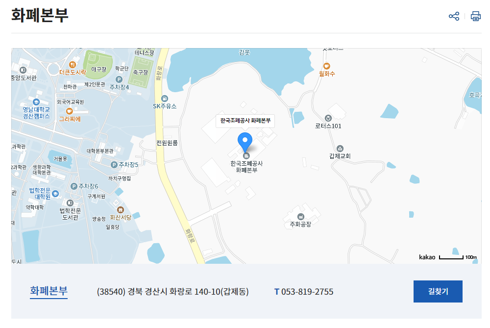 ㅇ화폐본부 : (38540) 경북 경산시 화랑로 140-10(갑제동)